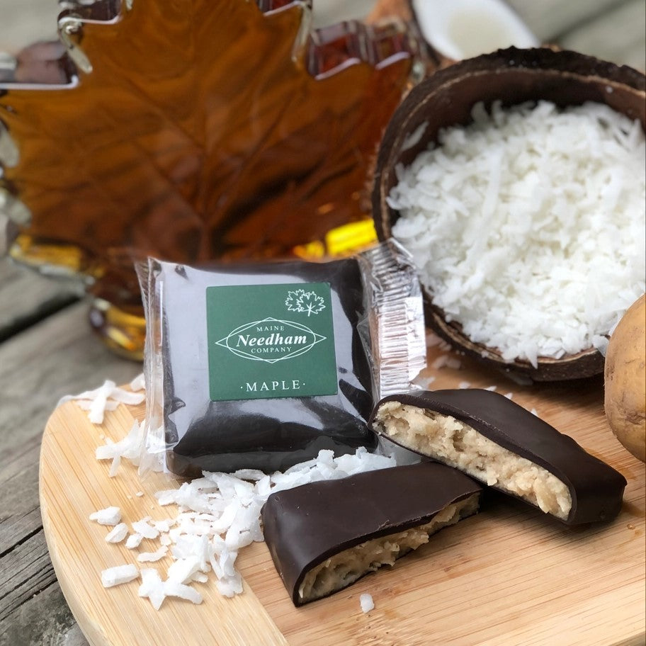 What is a Needham? A Needham is a traditional Maine candy with a coconut and potato filling covered in dark chocolate. The potato in the filling provides a rich texture unlike any other candy bar. Needhams were first created in the early 1870’s by candy-maker John Seavey and have become a favorite Maine treat.